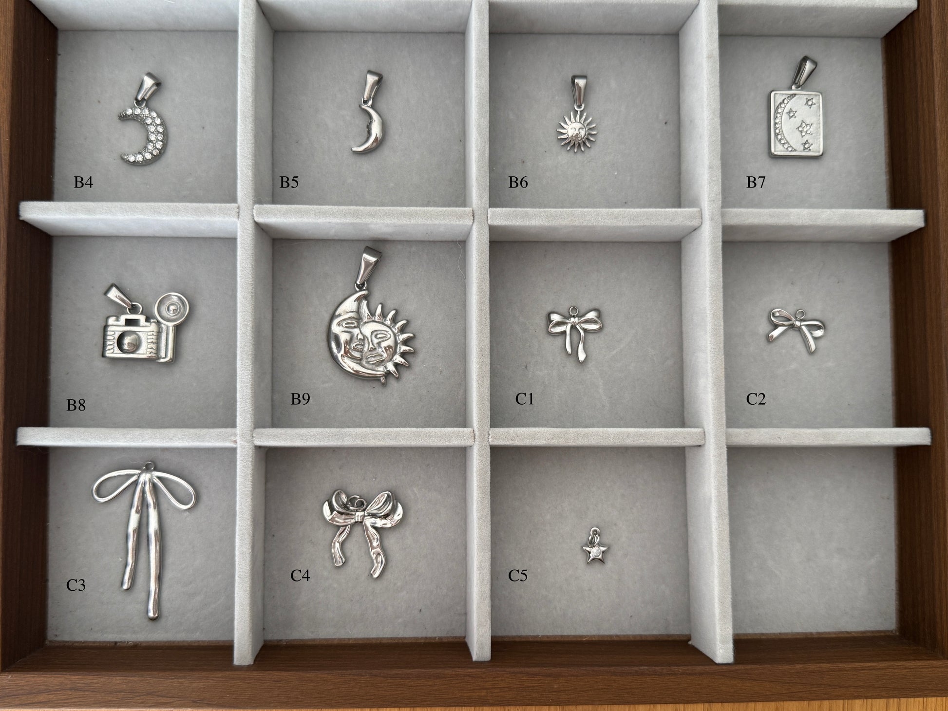⏣ List your chosen Charms/ Pendant and their order in the Personalisation Box , e.g. A2, C2, B1, G2 from Left to Right